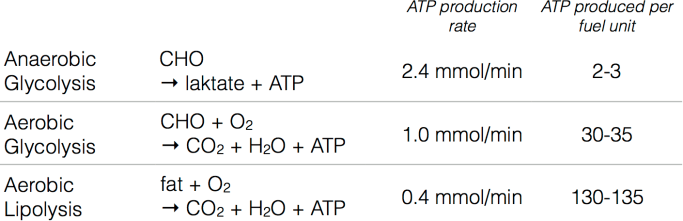 Beside the lactate production at anaerobic effort, it becomes clear that production rate of ATP is very high for anaerobic glycolysis, but a lot of fuel is needed to produce the same amount of energy compared with aerobic lipolysis.