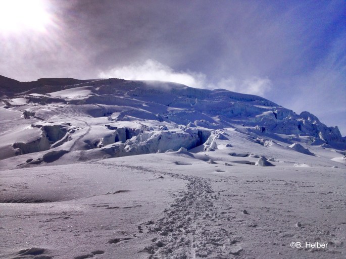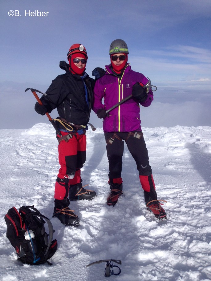 As soon as the first sunlight hits the retina and serotonin is released, a warm feeling of excitement after a long night out swells up in your body cells and the glacier turns into a beautiful deck of snow, with azure blue ice blocks and reeeeally deep crevasses to your left and right. Not to forget the amazing view that makes you feel kind of on top of the world. (fun fact: Cayambe is the highest point on the equator and the only point covered with snow, its peak is the point farthest from the Earth’s axis; thus it rotates the fastest as Earth spins wikipedia). The other higher volcanos Chimborazo and Cotopaxi show up on the horizon, as does a sea of clouds beneath your feet.
