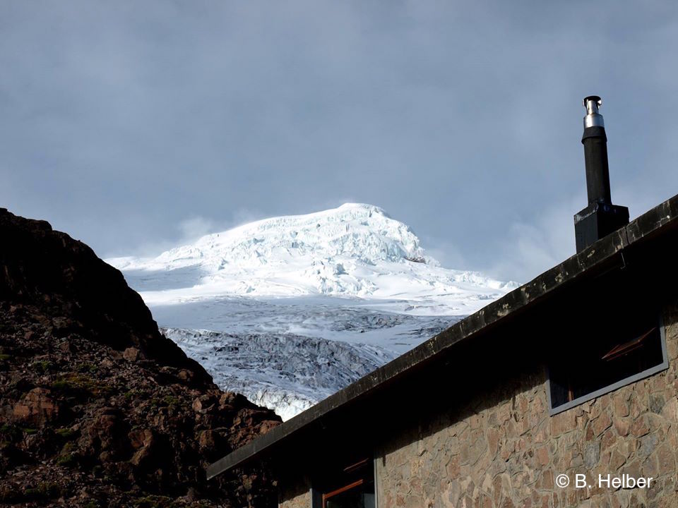 From Quito, we set off in the afternoon of 7 May 2016 at 2pm with a 4WD towards our “Refugio” at 4,600m altitude – a cozy small hut with some bunk beds and an oven, in the “common area”, the sleeping rooms were not heated. Before our nap at sunset, we tried on crampons, ice axe and harness withe ropes to make some trial-walks on the glacier, followed by a small dinner. For some of us. Not for all: